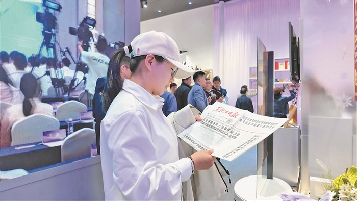 在黑龙江日报报业集团展区前,带着油墨香与丁香芬芳的纪念版报纸整齐陈列,这份特殊的报纸采用定制工艺,在印刷油墨中精心融入丁香花香料,指尖翻阅间,一缕缕清甜雅致的花香徐徐散开,为数字化时代的纸质阅读注入全新感官维度。