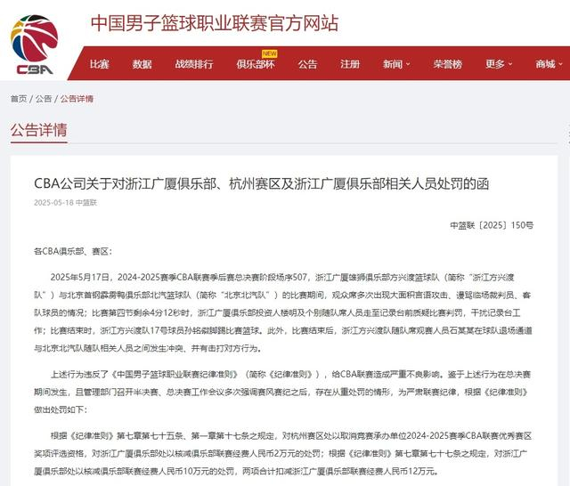 5月18日晚,CBA官网发布《CBA公司关于对浙江广厦俱乐部、杭州赛区及浙江广厦俱乐部相关人员处罚的函》。全文如下: