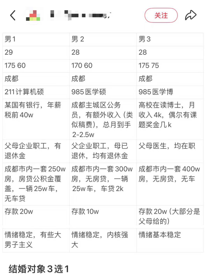 比如在某社交平台,虽然大家经常讨论不断变换的“crush”,但到了婚姻问题,但却经常发帖让大家帮自己“云相亲”,比较经典的例子就是列举出自己和对方的条件、或者几位“候选者”ABC的条件表格,让大家帮自己拿主意。