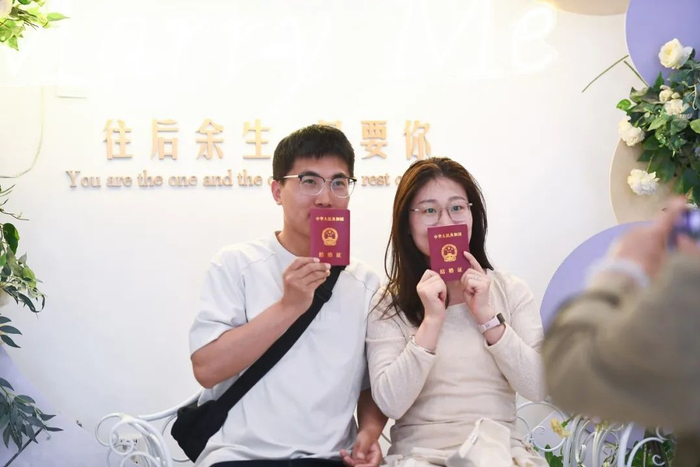 婚姻登记“全国通办”首日 多地新人预约登记结婚。2025年5月10日,手持结婚证的新人在江苏省南京市建邺区民政局婚姻登记处拍照留念。(图/视觉中国)