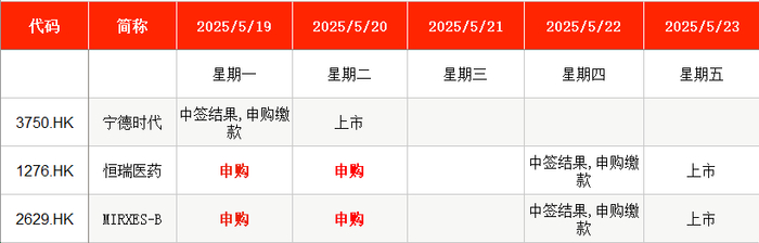 值得一提的是,A股龙头宁德时代新能源科技股份有限公司将于本周二(5月20日)在港股上市;江苏恒瑞医药股份有限公司则在本周一至周二(5月19日至5月20日)继续申购,并于本周五(5月23日)在港股上市。