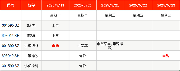 从时间表看,古麒绒材在周一(5月19日)申购,中策橡胶则在周五(5月23日)申购。