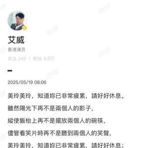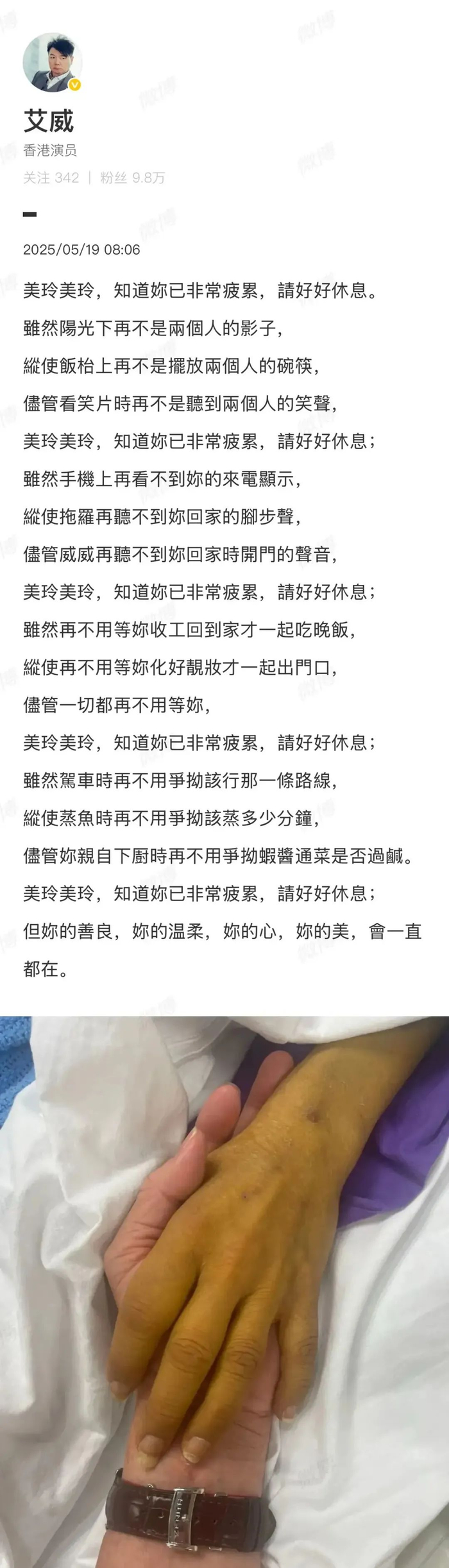 5月19日,《再见爱人2》嘉宾艾威发文悼念亡妻,他写道:“美玲美玲,知道你已非常疲累,请好好休息。虽然阳光下再不是两个人的影子,纵使饭枱上再不是摆放两个人的碗筷,尽管看笑片时再不是听到两个人的笑声,美玲美玲,知道你已非常疲累,请好好休息”。