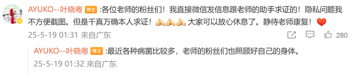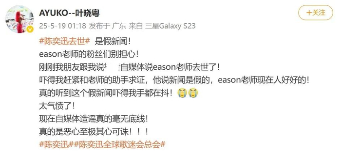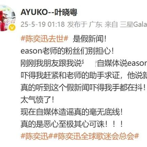 5月19日凌晨,歌手叶晓粤发文称陈奕迅去世是假新闻。叶晓粤表示自己和陈奕迅的助手求证了,“去世新闻”是假的,并强调“Eason老师现在人好好的”。