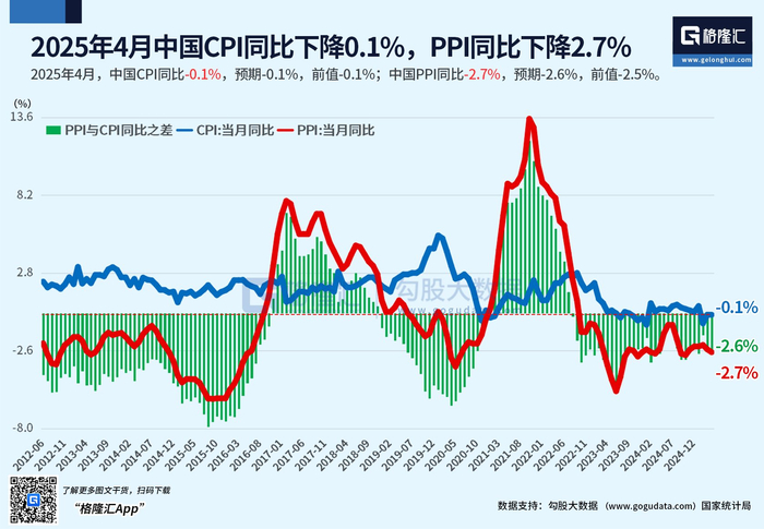 11、中国4月PPI同比-2.7%,预期-2.80%,前值-2.50%,环比-0.4%。