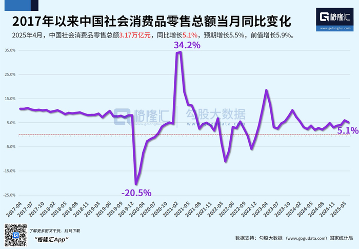 3、中国4月社会消费品零售总额37174亿元,同比5.1%,预期5.5%,前值5.9%。1-4月社会消费品零售总额161845亿元,增长4.7%。
