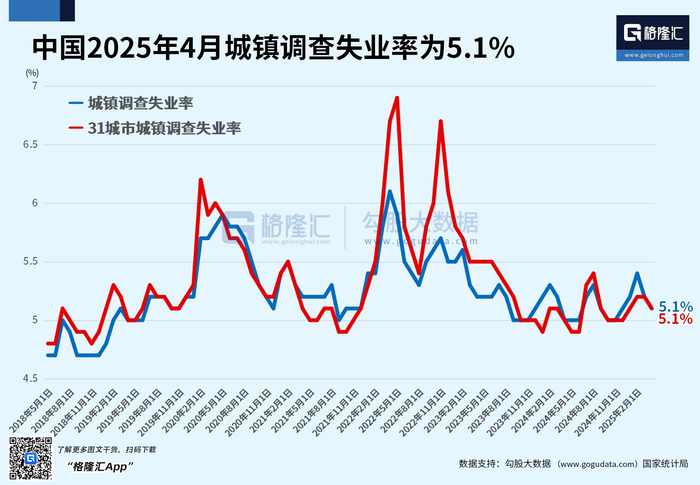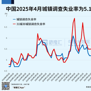 1、中国4月城镇调查失业率5.1%,预期5.2%,前值5.2%。1-4月份,全国城镇调查失业率平均值为5.2%,与上年同期持平。