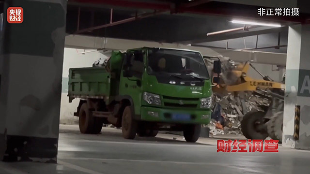记者在九华湖壹号小区物业指定的建筑垃圾堆放点,看见一辆货车将未分类的建筑垃圾装车、运走。