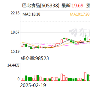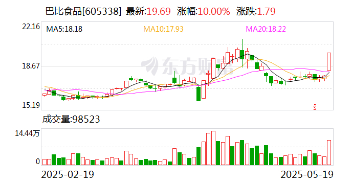 食品股表现活跃 巴比食品涨停 上海 2025.05.1909:52 关注 上证报中国证券网讯 5月19日,食品股表现活跃,截至9时45分,巴比食品涨停,立高食品涨超10%,天味食品涨近9%,承德露露、广州酒家等涨超4%。