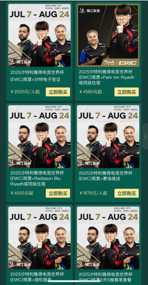 2024年底,锦江旅游在沙特正式成立“锦江国际旅游有限公司”,获得了第一张中国国有旅游企业在沙特的营业许可证。以此为契机,结合去年新开展的巴林海湾航空中国区总代(GSA)业务,锦江旅游将针对今年电竞世界杯特别推出丰富观赛套餐:包括EWC周票+沙特电子签证/丽笙酒店住宿/接机服务/赛场接送/的可选套餐,低至1876元起;以及包含EWC赛事门票、本地贴心丽笙酒店住宿、往返机票、当地交通在内的6天5晚观赛团尊享套餐等,满足不同的旅行需求。