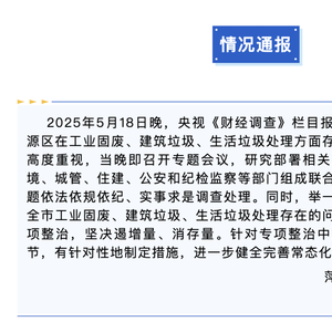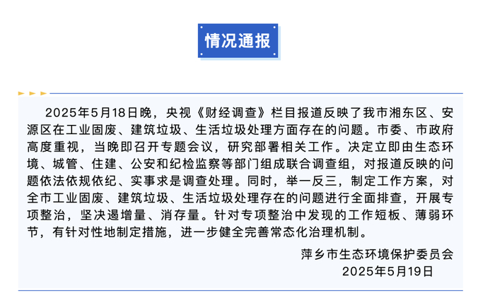 2025年5月18日晚,央视《财经调查》栏目报道反映了我市湘东区、安源区在工业固废、建筑垃圾、生活垃圾处理方面存在的问题。市委、市政府高度重视,当晚即召开专题会议,研究部署相关工作。决定立即由生态环境、城管、住建、公安和纪检监察等部门组成联合调查组,对报道反映的问题依法依规依纪、实事求是调查处理。同时,举一反三,制定工作方案,对全市工业固废、建筑垃圾、生活垃圾处理存在的问题进行全面排查,开展专项整治,坚决遏增量、消存量。针对专项整治中发现的工作短板、薄弱环节,有针对性地制定措施,进一步健全完善常态化治理机制。