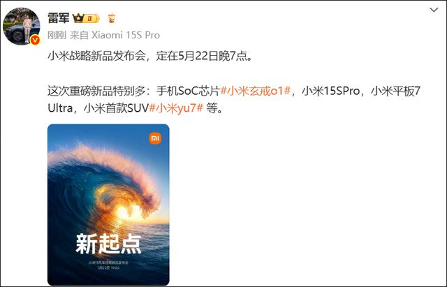 此前一小时,雷军发布微博官宣小米战略新品发布会,定在5月22日晚7点。