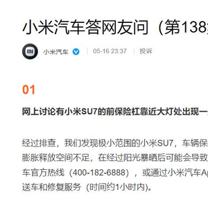 小米汽车称:“经过排查,我们发现极小范围的小米SU7,车辆保险杠在安装时因间隙调整不一致,边角位置尺寸膨胀释放空间不足,在经过阳光暴晒后可能会导致局部变形。如果您遇到此类情况,可致电小米汽车官方热线(400-182-6888),或通过小米汽车App进行服务预约,我们将为您提供免费的上门取送车和修复服务(时间约1小时内)。”