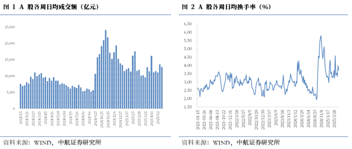 本周(2025.5.12-2025.5.16)A股日均成交额12663亿元,环比-6.44%;日均换手率3.72%,环比-0.27pct,本周,市场活跃度有所下降。
