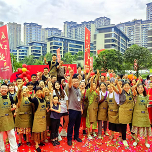 马家湾菜市场开业仪式现场,入驻商户与运营方代表合影
