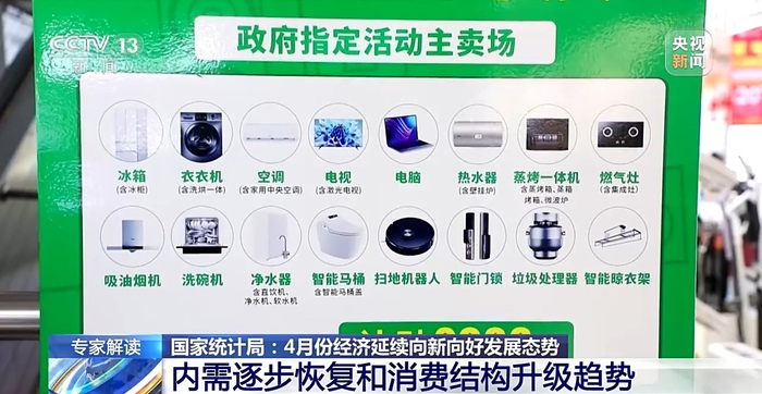 4月份社会消费品零售总额应该说同比增长也非常的明显,尤其是当中通信器材家电升级类的商品增速都超过了19%,家电网络零售额同比增长也超过了13%,绿色化智能化产品成为消费的趋势,这都显现政策驱动的以旧换新等等举措成效是非常显著的。同时线下消费热度应该说也是不断地增长,休闲娱乐、餐饮等等服务业消费的增速非常的亮眼,入境消费的热度也是创了新高,像免签和支付便利化政策,推动国际航班的班次增长,那么各地入境人数都是屡创新高,也显示中国消费市场对全球吸引力在增强。
