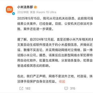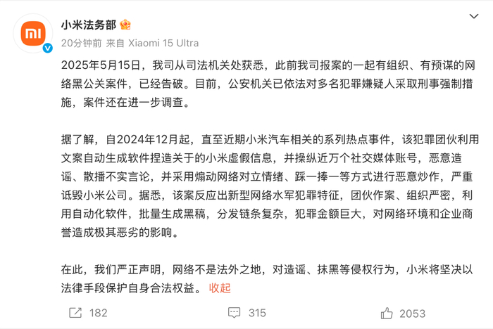 5月19日下午,小米法务部在社交平台发文称,2025年5月15日,公司从司法机关处获悉,此前公司报案的一起有组织、有预谋的网络黑公关案件,已经告破。目前,公安机关已依法对多名犯罪嫌疑人采取刑事强制措施,案件还在进一步调查。