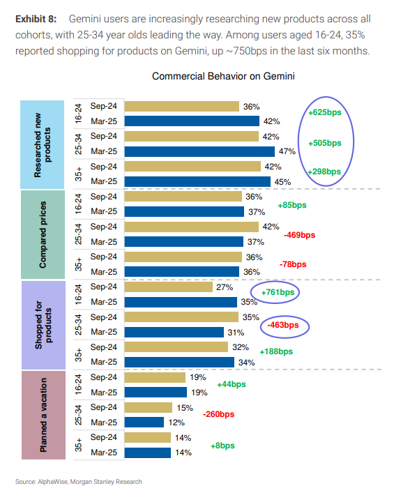 Gemini用户在所有年龄组都越来越多地研究新产品,25-34岁年龄段领先。16-24岁的用户中,35%报告在Gemini上购物,较6个月前增长约750个基点。