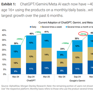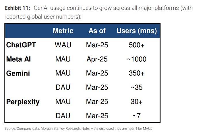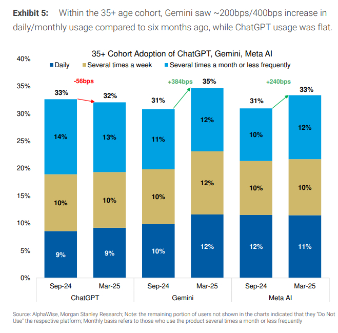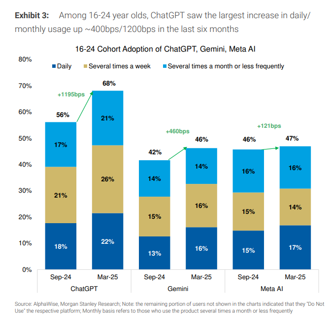 摩根士丹利称,从日活数据来看,约有3500万美国人每天使用ChatGPT、Gemini或Meta AI。在月度使用率方面,这三大平台各自吸引了约40%的16岁以上美国人,相当于每个平台约有1亿美国用户。但摩根士丹利也指出,这其中存在大量重叠用户。