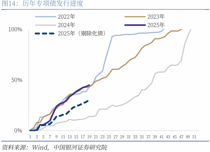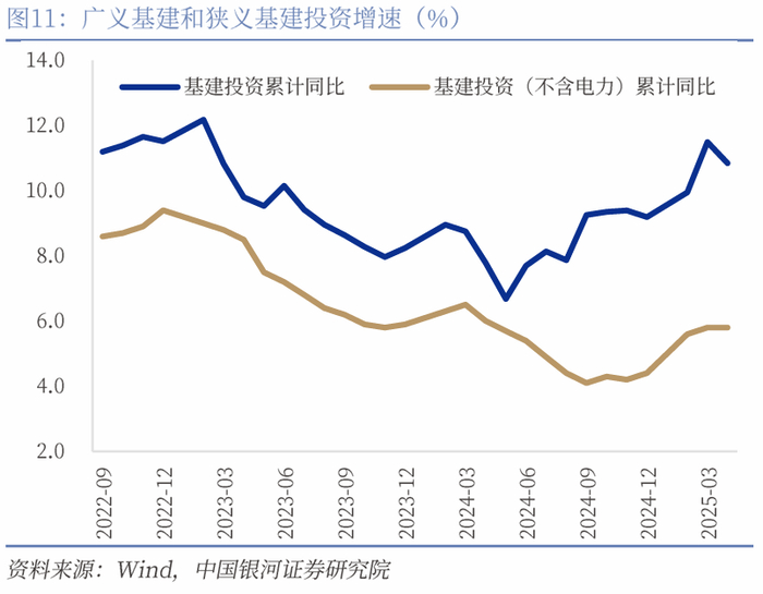 从资金端来看,年初政府债发行前置,但地方专项债发行仍有提速空间。1-4月政府债累计融资4.8万亿元,较去年同期多增约3.6万亿元,但其中有1.5万亿元为特殊再融资专项债(化债资金),即扣除化债因素后,今年地方专项债发行进度较2022年、2023年相比仍有较大提升空间。1-4月份基建主要支撑来自于国债和专项债发行前置,较去年同期分别多增1.2万亿元、4600亿元。目前来看,超长期特别国债刚刚启动发行,地方新增专项债亦有3万亿元左右待发规模,按照4月政治局会议加快落实存量政策的整体要求,预计二季度基建投资仍将保持稳定增长,全年增速应高于经济增速。