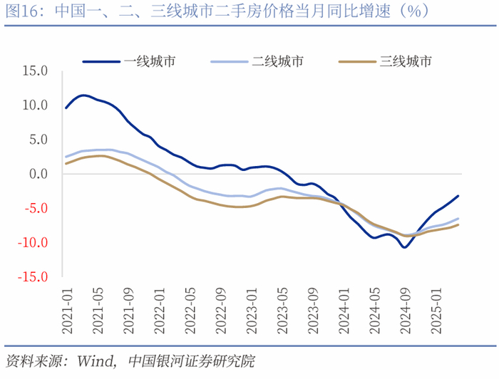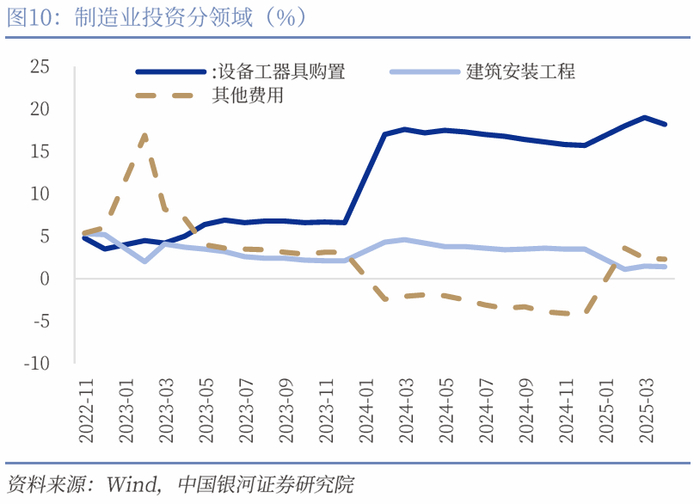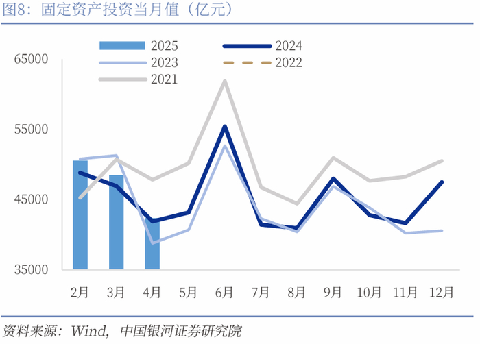 制造业投资边际放缓,铁路运输设备和汽车保持高增。1-4月制造业投资边际下滑0.3pct至8.8%。制造业投资在设备更新政策的带动下从2024年开始高速增长,2024全年累计增长9.2%,因此小幅边际放缓符合预期。分领域来看,1-4月设备工器具购置投资增速为18.2%(前值19%),设备更新政策的持续性仍在体现;建筑安装工程和其他费用均下滑0.1pct至1.4%和2.3%。分行业来看铁路船舶航空航天运输设备、通用设备和专用设备分别增长29.6%、17.9%和8.4%。消费制造业投资增速保持较高水平,汽车、食品、农副食品加工和纺织业增速分别为23.6%、16.6%、18.4%和14.7%。汽车制造业从2025年开始再度迎来高速扩张,结合产量和工业增加值来看新能源汽车的发展仍处于高速增长时期。汽车一是作为高技术制造业的代表,二是作为居民最重要消费品之一,三是出口前景广阔,对我国经济转型有较大提振作用。未来随着设备更新政策的边际效应递减以及外需的不确定性让企业暂时保持观望,制造业投资增速或进一步放缓,但仍将保持较高增速并向上拉动固定资产投资增速。