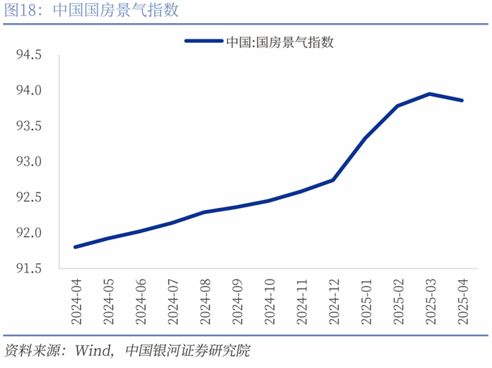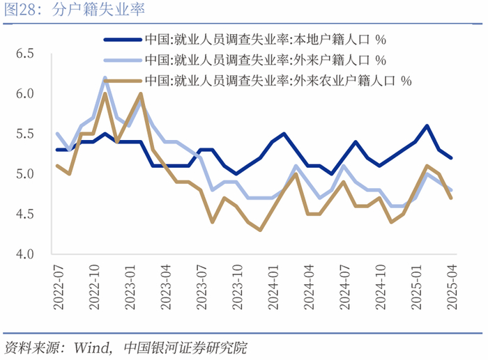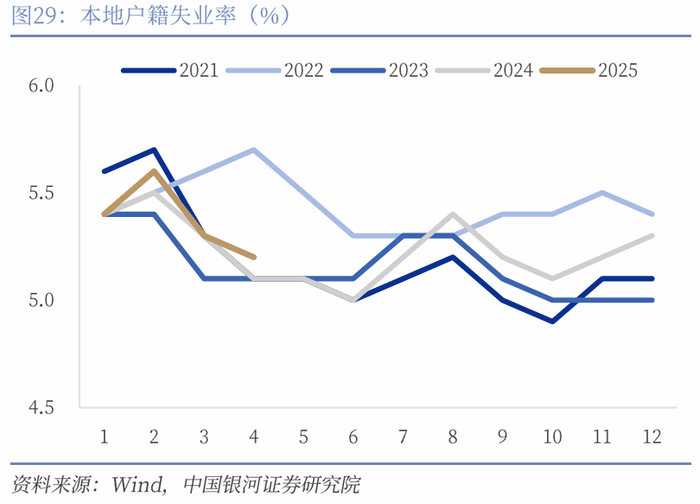 就业:“三抢”加大用工需求,关税谈判缓解就业压力。4月城镇调查失业率从5.2%下降到5.1%。分户籍来看,三种类别户籍失业率都有所下降,其中外来农业人口失业率改善最为显著,从5.0%降至4.7%。4月在“三抢”的带动下,企业用工需求较大,推动失业率改善。另外积极的信号是,就业人员平均工作小时环比下降0.2小时至48.3小时/周,一方面有利于扩大居民服务型消费需求,另一方面可能意味着“反内卷”政策正在发挥作用,在维持失业率稳定的情况下,改善工作时间有助于进一步扩大内需,推动价格回归正常,维持企业运营的可持续发展。同时,日内瓦谈判让美国和我国就对等关税的相关政策暂停90天实施,有助于我国基本面的企稳。不过仍要防范90天后关税卷土重来对就业市场造成潜在影响。