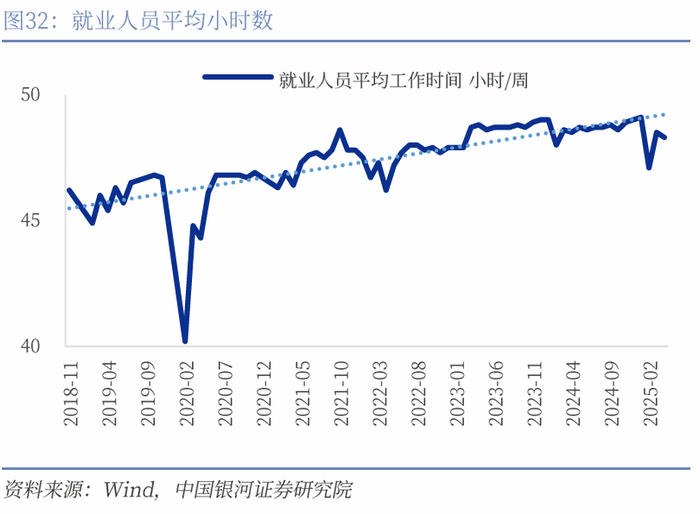 “三抢”加大企业用工需求,平均工作小时有所下降。4月城镇调查失业率从5.2%下降到5.1%,就业保持稳定。分户籍来看,三种类别户籍失业率都有所下降,其中本地户籍人口从5.3%降至5.2%,外来户籍人口从4.9%降至4.8%;外来农业人口失业率改善最为显著,从5.0%降至4.7%。4月在“三抢”的带动下,企业用工需求较大,推动失业率改善。另外积极的信号时就业人员平均工作小时环比下降0.2小时至48.3小时/周,不管是环比还是同比都有所下行。一方面,目前显著高于每周44小时的工作时间不利于扩大居民服务型消费需求,另一方面工作时间的改善也可能意味着“反内卷”政策正在发挥作用,在维持失业率稳定的情况下,改善工作时间有助于进一步扩大内需,促进企业良性经营,推动价格回归正常,维持企业运营的可持续发展。