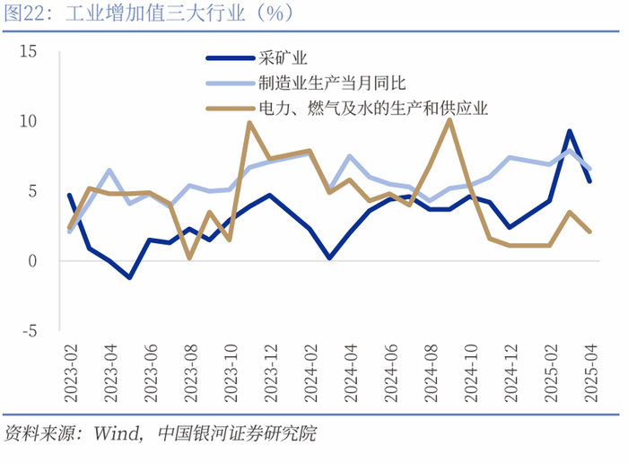 “三抢”拉动生产供给加快。我们认为支撑4月工业增加值强势增长的有三重因素。一是我国出口依旧维持较高韧性,特朗普4月暂停其他国家对等关税让我国转口贸易依旧保持较高韧性,4月我国出口商品3157亿美元,同比增速为8.1%(前值12.4%),其中4月份我国对越南出口增速22.5%(前值18.9%),对应越南出口增速21%(前值13.2%),我国对非美国家转口贸易高增长,部分抵消了对美出口下滑。二是企业抢“两新”的政策效应,通过4月的社零数据来看,消费品以旧换新政策持续显效,耐用消费品的需求在政策效应的带动下依然较为旺盛,带动制造业生产。三是抢“AI”,在Deepseek横空出世,国产人工智能和科技进入新发展阶段,人工智能相关产业链资本开支巨大,根据国家统计局新闻发布会,4月份,“人工智能+”的驱动作用在增强,数字产业蓬勃发展,我国规模以上数字产品制造业增加值同比增长10%。