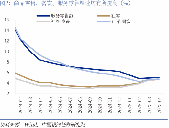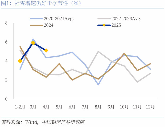 社零好于季节性,服务消费增速快于商品消费。4月社会消费品零售总额同比增长5.1%,较前值有所回落但仍高于社零季节性表现,较去年同期提高2.8个百分点。以旧换新政策支持领域零售增长较快,服务消费也在节假日带动下进一步升温。4月当月餐饮收入增速为5.2%,1-4月累计较前值提升0.1个百分点,1-4月服务零售额增速为5.1%,比整体快了0.4个百分点。