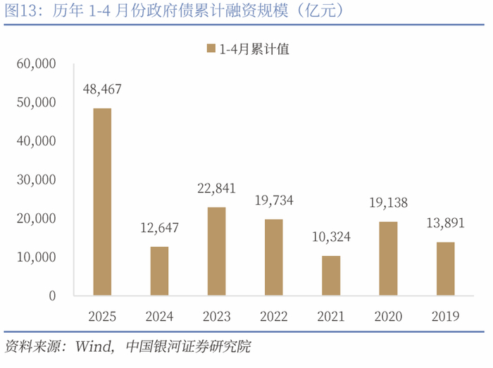 基建:边际增速回落,政府债发行仍有提速空间。1-4月狭义基建投资累计增速5.8%,与上月持平。估算当月投资增速5.8%(前值5.94%),整体来看4月基建投资增速保持稳定。其中水利投资仍是主要支撑,中央主导投资增长较快,地方基建投资仍有待提升。从资金端来看,年初政府债发行前置,但地方专项债发行仍有提速空间。1-4月政府债累计融资4.8万亿元,较去年同期多增约3.6万亿元,但其中有1.5万亿元为特殊再融资专项债(化债资金),即扣除化债因素后,今年地方专项债发行进度较2022年、2023年相比仍有较大提升空间。目前来看,超长期特别国债刚刚启动发行,地方新增专项债亦有3万亿元左右待发规模,按照4月政治局会议加快落实存量政策的整体要求,预计二季度基建投资仍将保持稳定增长,全年增速应高于经济增速。