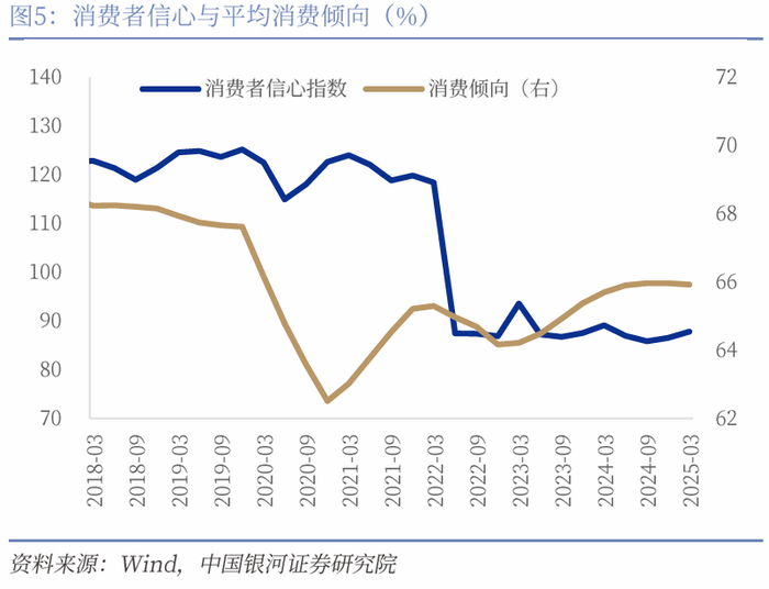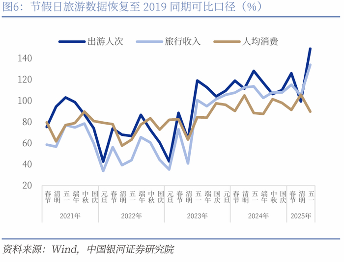 消费者信心趋于稳定叠加去年较低基数,年内消费或步入“新常态”。一方面,今年一季度消费倾向与去年几乎持平,消费者信心指数较去年底小幅改善,经历疫后连续几年的消费信心低迷后,整体来看消费者消费意愿已趋于稳定;另一方面,去年低基数因素或对今年增速有支撑。2024年社零四个季度增速分别为4.7%、2.6%、2.7%、3.8%,今年消费增速能在基数效应支撑下保持平稳向好势头。“五一”假期消费数据或预示着消费者行为进入“新常态”。“五一”假期期间,全社会跨区域人员流动量累计14.67亿人次,同比增长8.0%,全国重点零售和餐饮企业销售额同比增长6.3%,但人均消费支出保持稳定,火热的假日出行与消费支出平稳或预示着消费者行为进入“新常态”,更重旅游、娱乐等“体验型”服务消费的同时,支出也更加理性。