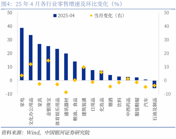 以旧换新政策仍是社零主要拉动因素,但政策拉动作用或有所下降。4月限额以上单位商品零售额增长最快的为家电类、文化办公用品类、家具类,分别增长38.8%、33.5%、26.9%,通讯器材也实现了19.9%的较高增速,消费品以旧换新仍是社零增长主要贡献项。但家具、汽车和通讯器材零售增速环比的下滑或显示政策拉动作用有所下降,通讯器材和汽车零售增速较3月环比分别下降8.7%、4.8%。若将限额以上商品零售分为以旧换新类和非以旧换新类来看,4月以旧换新类增速为11.6%,高于总体的9.7%,但较前值14.0%下滑了2.4%,或意味着现有消费刺激政策的拉动效应边际下滑,及时出台增量消费政策以保持消费增长强度的必要性有所提高。
