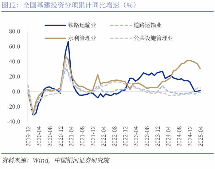 制造业:制造业投资边际放缓,铁路运输设备和汽车保持高增。1-4月制造业投资边际下滑0.3pct至8.8%。制造业投资在设备更新政策带动下,自去年以来持续高增,小幅边际放缓符合预期。分领域来看,1-4月设备工器具购置投资增速为18.2%(前值19%),设备更新政策的持续性仍在体现。分行业来看铁路船舶航空航天运输设备、通用设备和专用设备分别增长29.6%、17.9%和8.4%。消费制造业投资增速保持较高水平,汽车、食品、农副食品加工和纺织业增速分别为23.6%、16.6%、18.4%和14.7%。汽车制造业从2025年开始再度迎来高速扩张,结合产量和工业增加值来看新能源汽车的发展仍处于高速增长时期。未来随着设备更新政策的边际效应递减以及外需的不确定性让企业暂时保持观望,制造业投资增速或进一步放缓,但仍将保持较高增速并向上拉动固定资产投资增速。