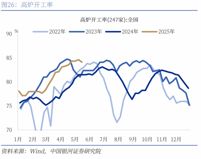 工业增加值4月继续保持较高增速。4月份,工业增加值从上月7.7%下降到6.1%,但仍维持较高增速,尤其是去年同期增幅为6.7%,已经有较高增速,今年在高基数的基础上再度录得6.1%的增速凸显工业生产对经济的支撑。其中装备制造业和高技术制造业较快增长。分三大门类看,采矿业增加值同比增长5.7%(前值6.2%),制造业增长6.6%(前值7.1%),电力、热力、燃气及水生产和供应业增长2.1%(前值1.9%)。装备制造业增加值同比增长9.8%,高技术制造业增加值增长10.0%,分别快于全部规模以上工业增加值3.7和3.9个百分点。从高频指标来看,高炉开工率保持较高水平,4月录得83.6%,同比增加2.82pct,高炉开工率今年截至目前都高于去年同期。