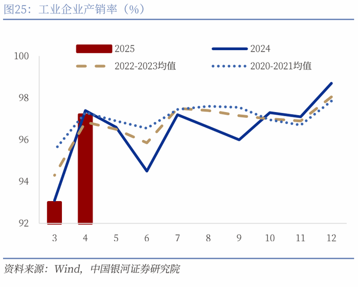 产销不算突出,未来在出口受挫的压力下,扩内需政策仍会加力。4月产销率为97.2%,较去年同期下降0.2个百分点。四月产销率虽然小幅下降,但仍维持97%以上的水平,意味着4月需求的下降并不明显。不过我们还需要继续观察未来企业的产销率,在未来出口受挫的潜在背景下,内需的韧性是维持工业经济的关键。