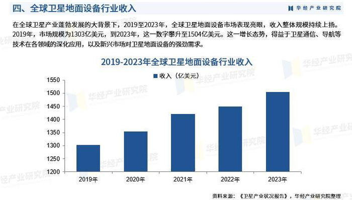 在全球卫星产业蓬勃发展的大背景下,2019至2023年,全球卫星地面设备市场表现亮眼,收入整体规模持续上扬。2019年,市场规模为1303亿美元,到2023年,这一数字攀升至1504亿美元。