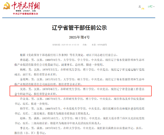 5月19日金融一线消息,辽宁省委组织部信息显示,现任辽宁省委金融工作委员会专职副书记吴涛拟任省管企业正职。