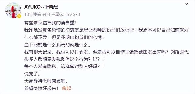 有些来私信骂我的请自重!我昨晚发那条微博的初衷就是想让老师的粉丝们放心些!我原本可以自己知道就好什么都不发,但是我明白粉丝们的心情!当下问的是什么我说的就是什么。我有聊天记录,我也可以打码发,但是我可以自作主张把截图发出来吗?网络时代很多人都随意发截图但这个行为对吗?!每个人都有隐私,这样做对别人好吗?!说完了。大家静待老师康复吧。希望快快好起来!