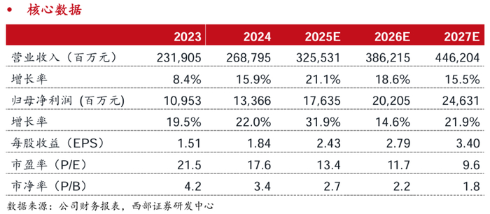 我们预计2025-2027年公司营收分别为3255.3/3862.2/4462.0亿元, 归母净利润分别为176.4/202.1/246.3 亿元。我们看好公司未来业务扩张带来的收入及利润持续提升,维持“买入”评级。