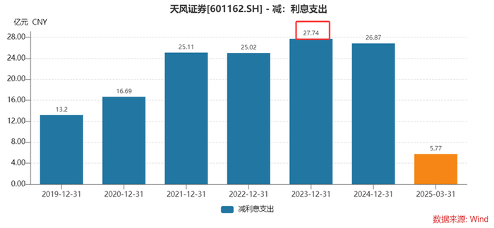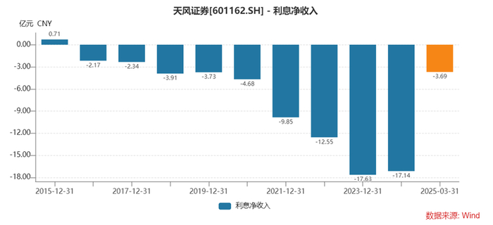 此外,公司当前的债务结构极为不合理。2023年年底,天风证券应付债券账面金额高达446.16亿元,占总资产的比例达到44.82%,在46家上市券商中居于首位。进入2025年,应付债券金额依旧维持高位,这意味着公司每年需要承担巨额的利息支出。数据显示,天风证券利息支出在2023年创下了27.74亿元的历史高点,是当年净利润的6.6倍,如此高额的利息支出直接导致公司的息差收入常年为负。Wind数据显示,公司已经连续10年息差收入为负。如此高额的利息负担,严重侵蚀了公司的利润空间,使得公司在经营上捉襟见肘,资金流动性面临严峻考验。