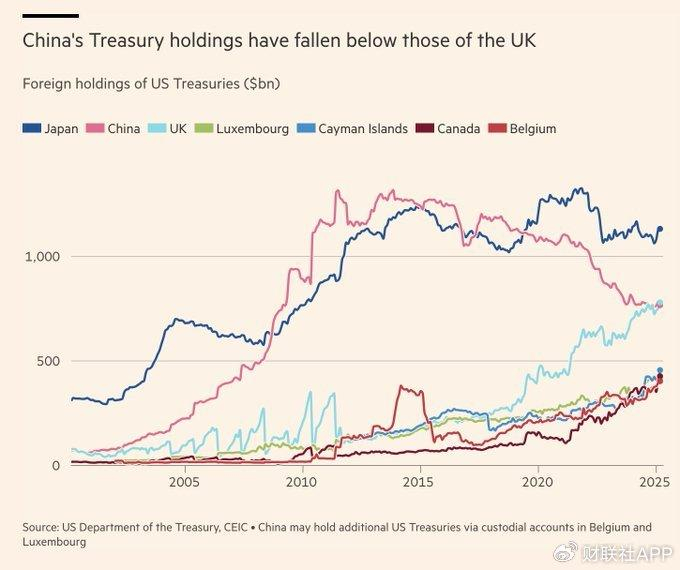 美国财政部当地时间上周五(5月16日)公布了2025年3月的国际资本流动报告(TIC)。报告显示,自本世纪初以来,中国的美债持有量首次低于了英国,从而被后者超越,退居成为了美国第三大海外“债主”。