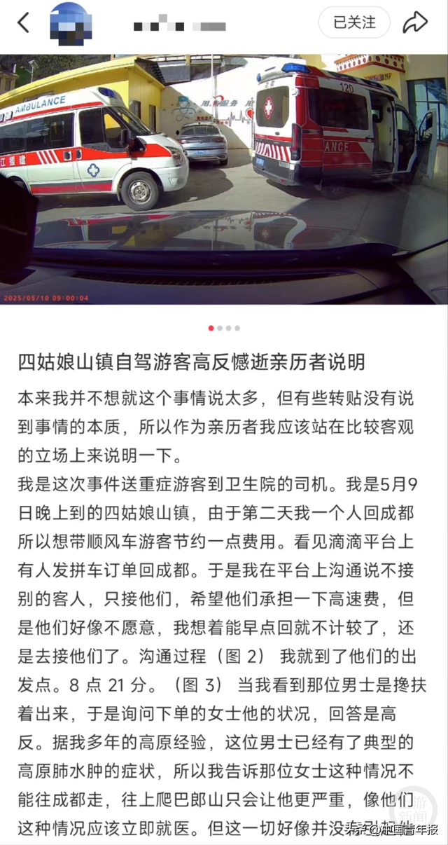 在四姑娘山镇因高反去世的男子就遇上了这种情况。据同行者表示,他们到四姑娘山镇已经是第三天。“第一天洗了澡,穿得有点少,可能有点感冒并伴有咳嗽。”接该男子的顺风车司机曾表示:“根据我多年的高原经验,这名男子已经有了典型的高原肺水肿症状,像这种情况应该立即就医。”尽管他们用最快速度将男子送至镇卫生院,但还是没能留住这名游客的生命。