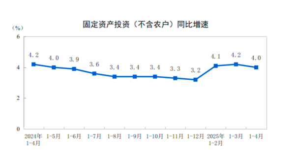 国家统计局5月19日发布的数据显示,4月份,全国规模以上工业增加值同比增长6.1%,比上月回落1.6个百分点;社会消费品零售总额同比增长5.1%,比前值放缓0.8个百分点。1-4月份,全国固定资产投资(不含农户)同比增长4.0%,比一季度回落0.2个百分点。