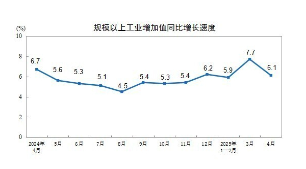 4月份,规模以上工业增加值同比增长6.1%。41个大类行业中,36个行业同比增长,增长面超过八成。