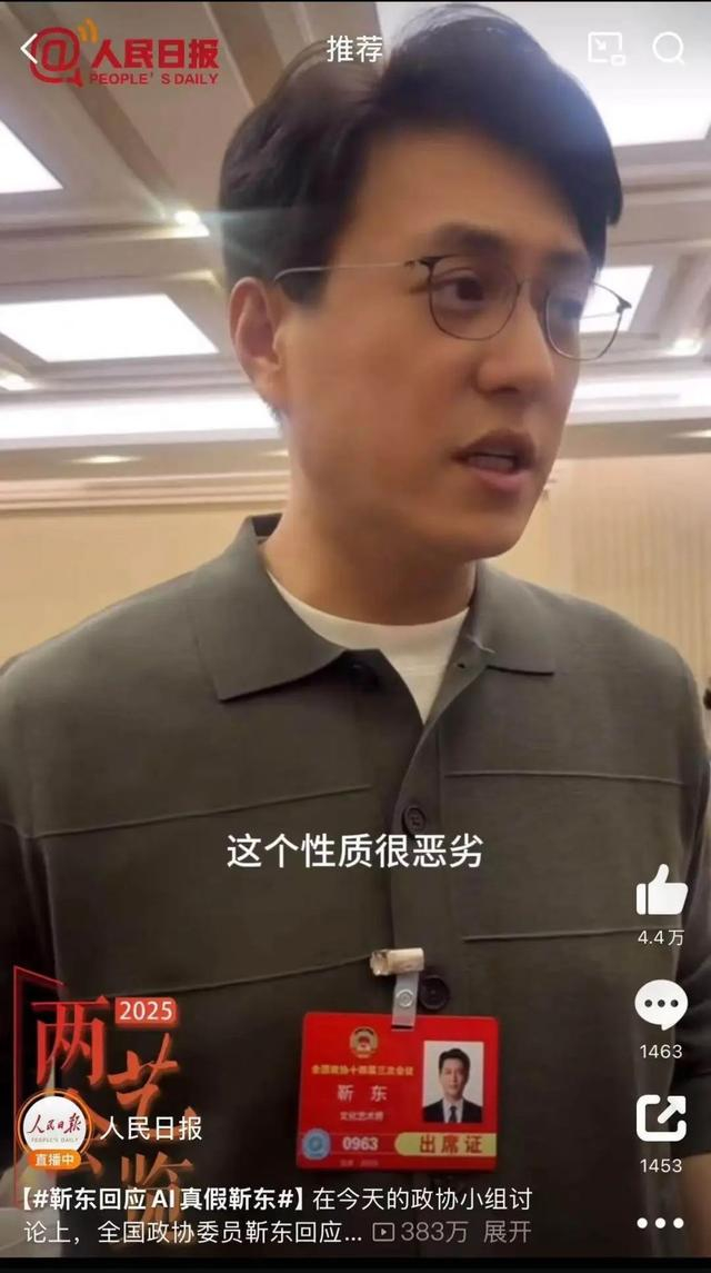 “一些喜欢我影视剧的观众,被AI换脸视频骗得很惨,这个性质非常恶劣。希望能建立更好的规则。”靳东说。