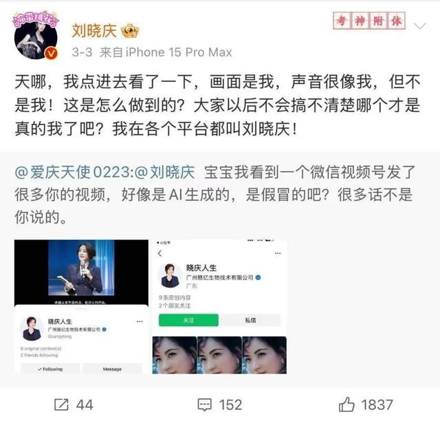 此前、刘晓庆、古天乐、林峯等明星艺人也曾针对AI“假人”视频公开辟谣。