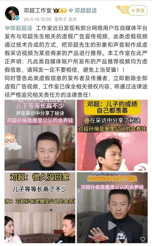 5月18日,知名演员邓超、孙俪夫妇工作室发文打假AI虚假广告,表示发现有部分网络用户在自媒体平台发布与邓超、孙俪相关的虚假广告宣传视频,这类视频通过技术合成的方式将邓超、孙俪的形象和声音制作成虚假采访视频为某些商家的产品进行推荐。“凡此类自媒体账户所发布的产品推荐视频均为虚假信息,请网友一定不要相信,避免上当受骗!”