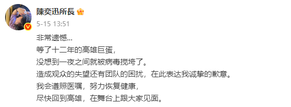 5月15日,陈奕迅曾发布微博,提到“等了十二年的高雄巨蛋,没想到一夜之间被病毒搅垮”。他还表示会遵照医嘱努力恢复健康,尽快回到高雄在舞台上跟大家见面。