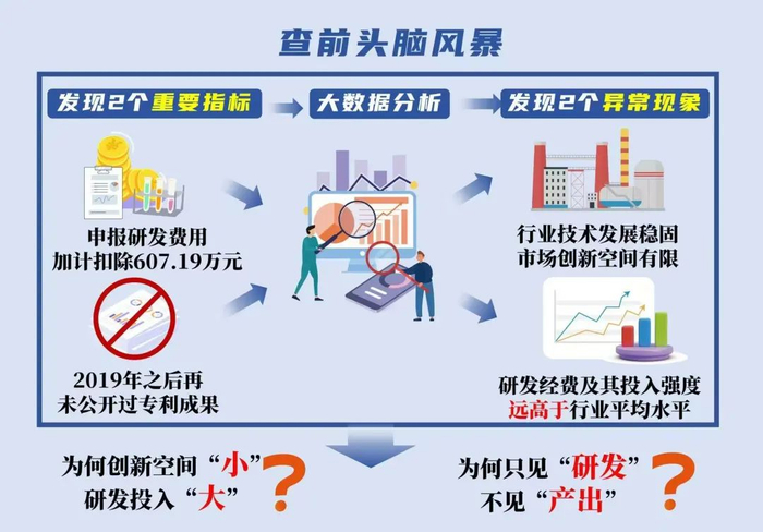 为进一步核实王某所述情况,检查人员依法从该公司调取了账簿凭证和研发资料,深入分析研发台账后,发现检查所属期间该公司只登记了两个研发项目。这两个研发项目内容高度相似、时间首尾相连,年均投入研发费用超过200万元,却始终没有任何研发成果,甚至连阶段性报告或结题报告都没有。