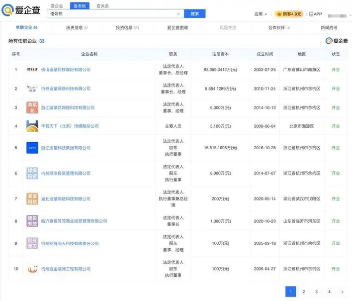 爱企查App显示,谢如栋名下关联超30家企业,涉及科技、传媒、投资等领域,其中超10家为开业状态,包括佛山遥望科技股份有限公司、杭州遥望网络科技有限公司、浙江游菜花网络科技有限公司等。在上述为开业状态的企业中,谢如栋担任法定代表人、董事长、执行董事等职务。